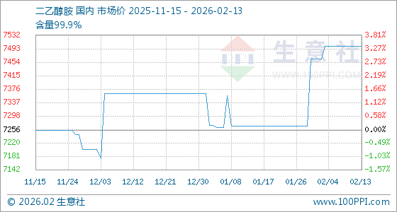 2月13日,生意社二乙醇胺基准价为7500.00元/吨,与本月初(7464.29元/吨)相比,上涨了0.48%。