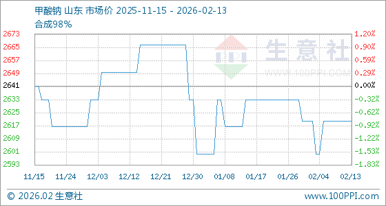 2月13日,生意社甲酸钠基准价为2620.00元/吨,与本月初持平。