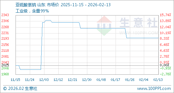 2月13日,生意社亚硫酸氢钠基准价为2200.00元/吨,与本月初持平。