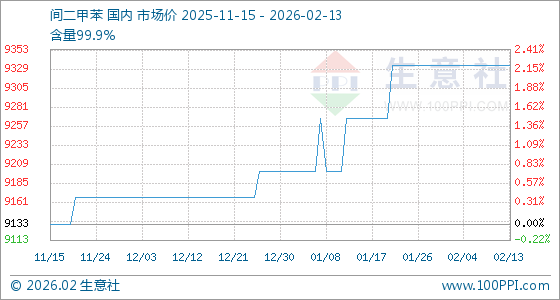 2月13日,生意社间二甲苯基准价为9333.33元/吨,与本月初持平。