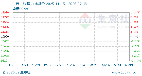 2月13日,生意社二丙二醇基准价为10900.00元/吨,与本月初持平。