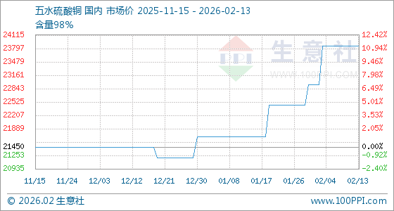 2月13日,生意社五水硫酸铜基准价为23850.00元/吨,与本月初(22933.33元/吨)相比,上涨了4.00%。