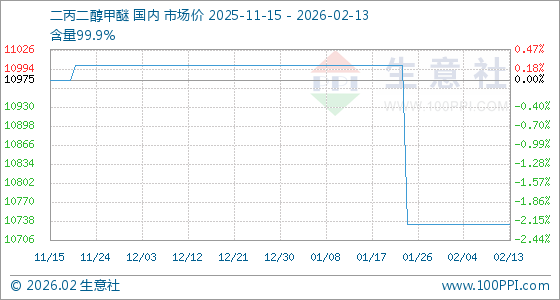 2月13日,生意社二丙二醇甲醚基准价为10733.33元/吨,与本月初持平。