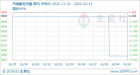 2月13日,生意社丙烯酸羟丙酯基准价为9650.00元/吨,与本月初持平。