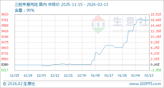 2月13日,生意社三羟甲基丙烷基准价为9770.00元/吨,与本月初(9430.00元/吨)相比,上涨了3.61%。