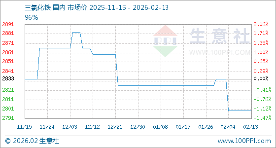 2月13日,生意社三氯化铁基准价为2800.00元/吨,与本月初(2833.33元/吨)相比,下降了1.18%。