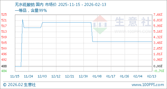 2月13日,生意社无水硫酸钠基准价为506.00元/吨,与本月初持平。