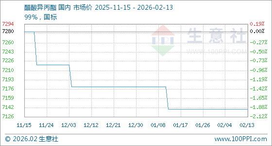 2月13日,生意社醋酸异丙酯基准价为7140.00元/吨,与本月初持平。