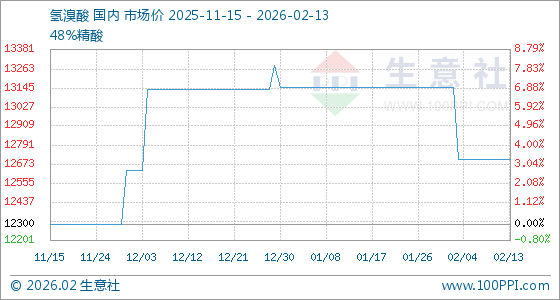 2月13日,生意社氢溴酸基准价为12700.00元/吨,与本月初(13150.00元/吨)相比,下降了3.42%。