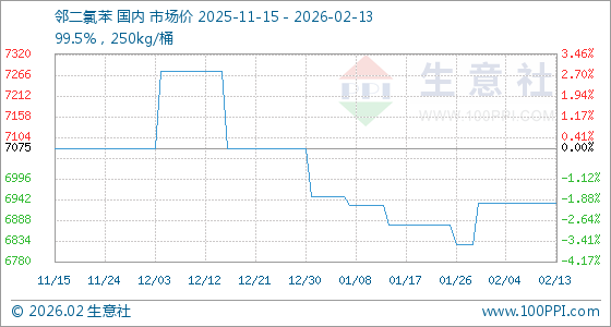 2月13日,生意社邻二氯苯基准价为6933.33元/吨,与本月初持平。