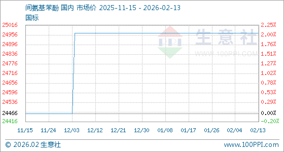 2月13日,生意社间氨基苯酚基准价为24966.67元/吨,与本月初持平。