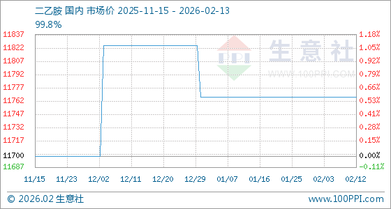 2月13日,生意社二乙胺基准价为11766.67元/吨,与本月初持平。