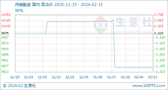 2月13日,生意社丙烯酰胺基准价为9833.33元/吨,与本月初持平。