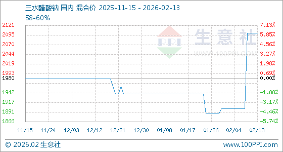 2月13日,生意社三水醋酸钠基准价为2100.00元/吨,与本月初(1900.00元/吨)相比,上涨了10.53%。