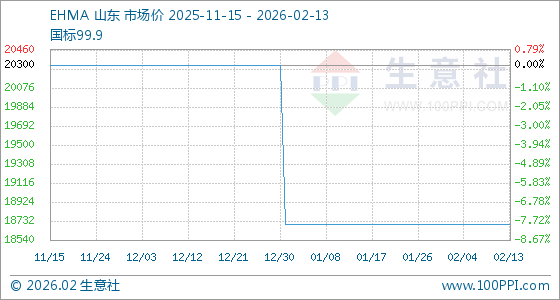 2月13日,生意社EHMA基准价为18700.00元/吨,与本月初持平。
