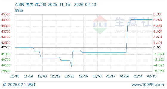 2月13日,生意社AIBN基准价为45000.00元/吨,与本月初持平。