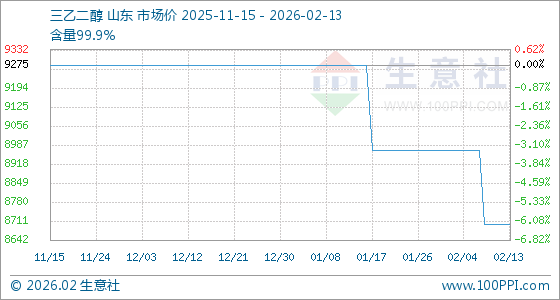 2月13日,生意社三乙二醇基准价为8700.00元/吨,与本月初(8966.67元/吨)相比,下降了2.97%。