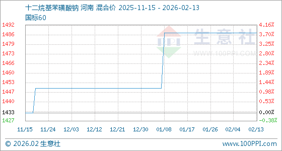 2月13日,生意社十二烷基苯磺酸钠基准价为1487.50元/吨,与本月初持平。