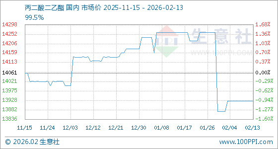 2月13日,生意社丙二酸二乙酯基准价为13925.00元/吨,与本月初(13875.00元/吨)相比,上涨了0.36%。