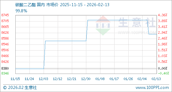 2月13日,生意社碳酸二乙酯基准价为8616.67元/吨,与本月初(8712.50元/吨)相比,下降了1.1%。