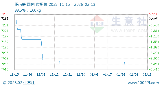 2月13日,生意社正丙醛基准价为7062.50元/吨,与本月初持平。