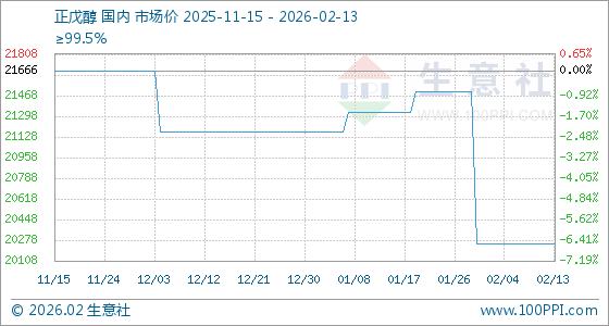 2月13日,生意社正戊醇基准价为20250.00元/吨,与本月初持平。