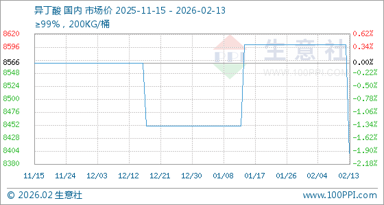 2月13日,生意社异丁酸基准价为8600.00元/吨,与本月初持平。
