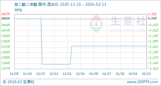 2月13日,生意社癸二酸二辛酯基准价为23750.00元/吨,与本月初持平。