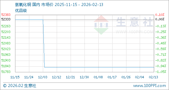 2月13日,生意社氢氧化铜基准价为51833.33元/吨,与本月初持平。