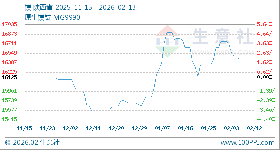 2月13日,生意社镁基准价为16450.00元/吨,与本月初(16750.00元/吨)相比,下降了1.79%。