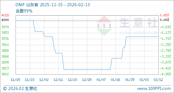 2月13日,生意社DMF基准价为3940.00元/吨,与本月初持平。