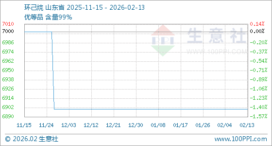 2月13日,生意社环己烷基准价为6900.00元/吨,与本月初持平。