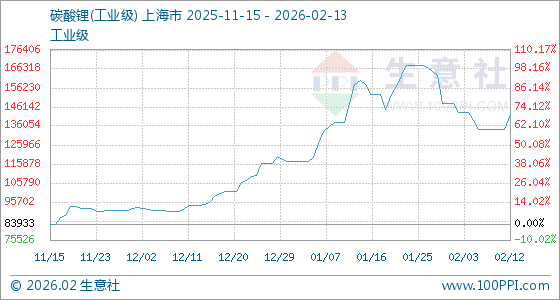 2月13日,生意社碳酸锂(工业级)基准价为142000.00元/吨,与本月初(148000.00元/吨)相比,下降了4.05%。