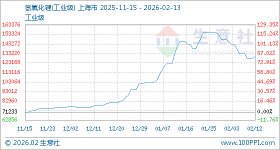 2月13日,生意社氢氧化锂(工业级)基准价为130000.00元/吨,与本月初(148000.00元/吨)相比,下降了12.16%。