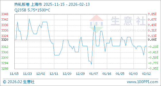 2月13日,生意社热轧板卷基准价为3313.33元/吨,与本月初(3323.33元/吨)相比,下降了0.3%。