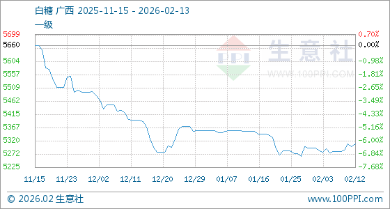 2月13日,生意社白糖基准价为5310.00元/吨,与本月初(5295.00元/吨)相比,上涨了0.28%。