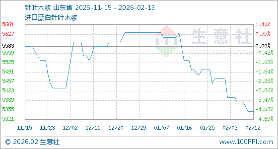 2月13日,生意社针叶木浆基准价为5350.00元/吨,与本月初(5466.67元/吨)相比,下降了2.13%。