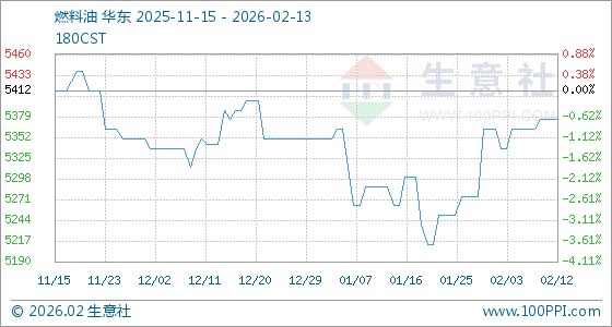2月13日,生意社燃料油基准价为5375.00元/吨,与本月初(5362.50元/吨)相比,上涨了0.23%。