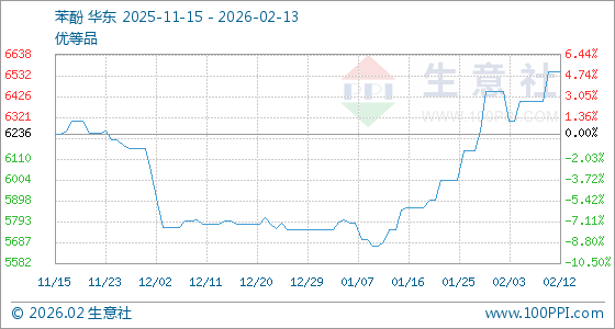2月13日,生意社苯酚基准价为6550.00元/吨,与本月初(6450.00元/吨)相比,上涨了1.55%。