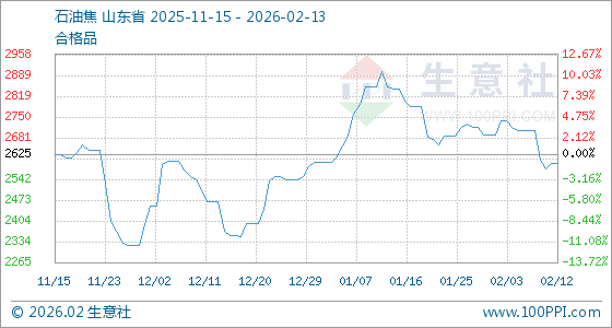 2月13日,生意社石油焦基准价为2595.75元/吨,与本月初(2691.75元/吨)相比,下降了3.57%。