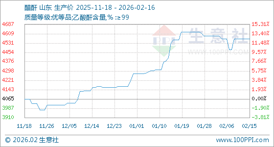 2月16日,生意社醋酐基准价为4565.00元/吨,与本月初(4590.00元/吨)相比,下降了0.54%。