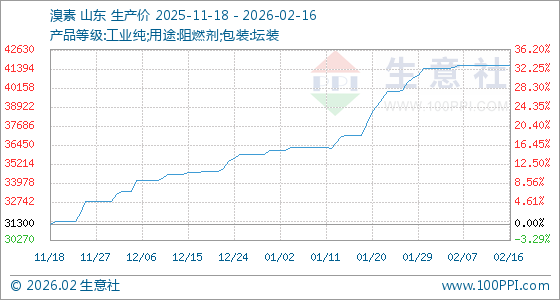 2月16日,生意社溴素基准价为41600.00元/吨,与本月初(41400.00元/吨)相比,上涨了0.48%。