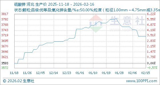 2月16日,生意社硫酸钾基准价为3716.67元/吨,与本月初(3760.00元/吨)相比,下降了1.15%。