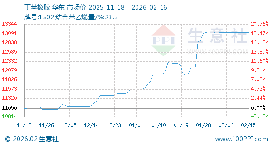 2月16日,生意社丁苯橡胶基准价为13125.00元/吨,与本月初(13133.33元/吨)相比,下降了0.06%。
