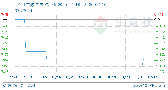 2月16日,生意社1,4-丁二醇基准价为7371.43元/吨,与本月初(7357.14元/吨)相比,上涨了0.19%。