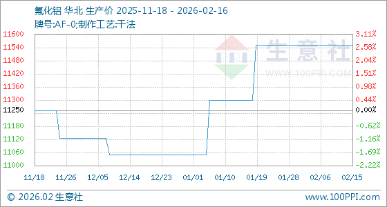 2月16日,生意社氟化铝基准价为11550.00元/吨,与本月初持平。