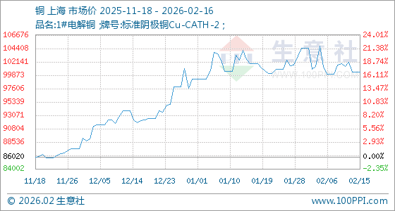2月16日,生意社铜基准价为100356.67元/吨,与本月初(104496.67元/吨)相比,下降了3.96%。