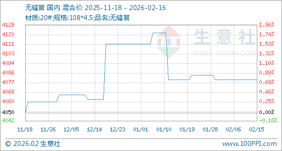2月16日,生意社无缝管基准价为4080.00元/吨,与本月初持平。