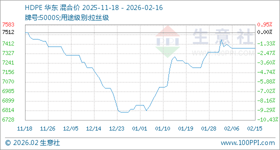 2月16日,生意社HDPE基准价为7375.00元/吨,与本月初(7337.50元/吨)相比,上涨了0.51%。