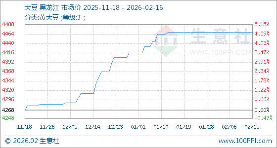 2月16日,生意社大豆基准价为4468.00元/吨,与本月初持平。